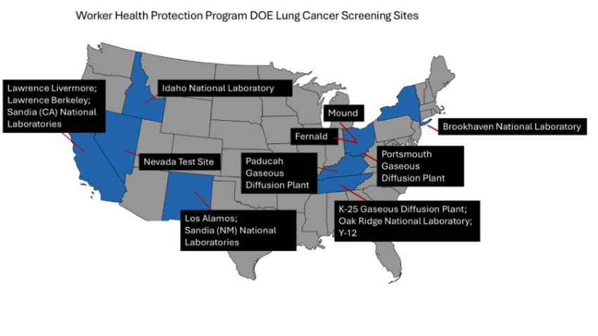 Since 2000, the Worker Health Protection Program (WHPP) Early Lung Cancer Detection Program (ELCD) has provided low-dose chest CT scans to at risk U.S. Department of Energy (DOE) workers, mostly retired, for the purpose of detecting lung cancers at an early treatable stage. This program has expanded over the past 25 years and now serves DOE workers at 15 different DOE sites in 8 states (see map below), including flagship DOE sites in Oak Ridge TN (Oak Ridge National Laboratory, Y-12, and K-25), New Mexico (Los Alamos and Sandia National Laboratories), and Nevada (National Security Site, formerly the Nevada Test Site). This work is supported by the Department of Energy.